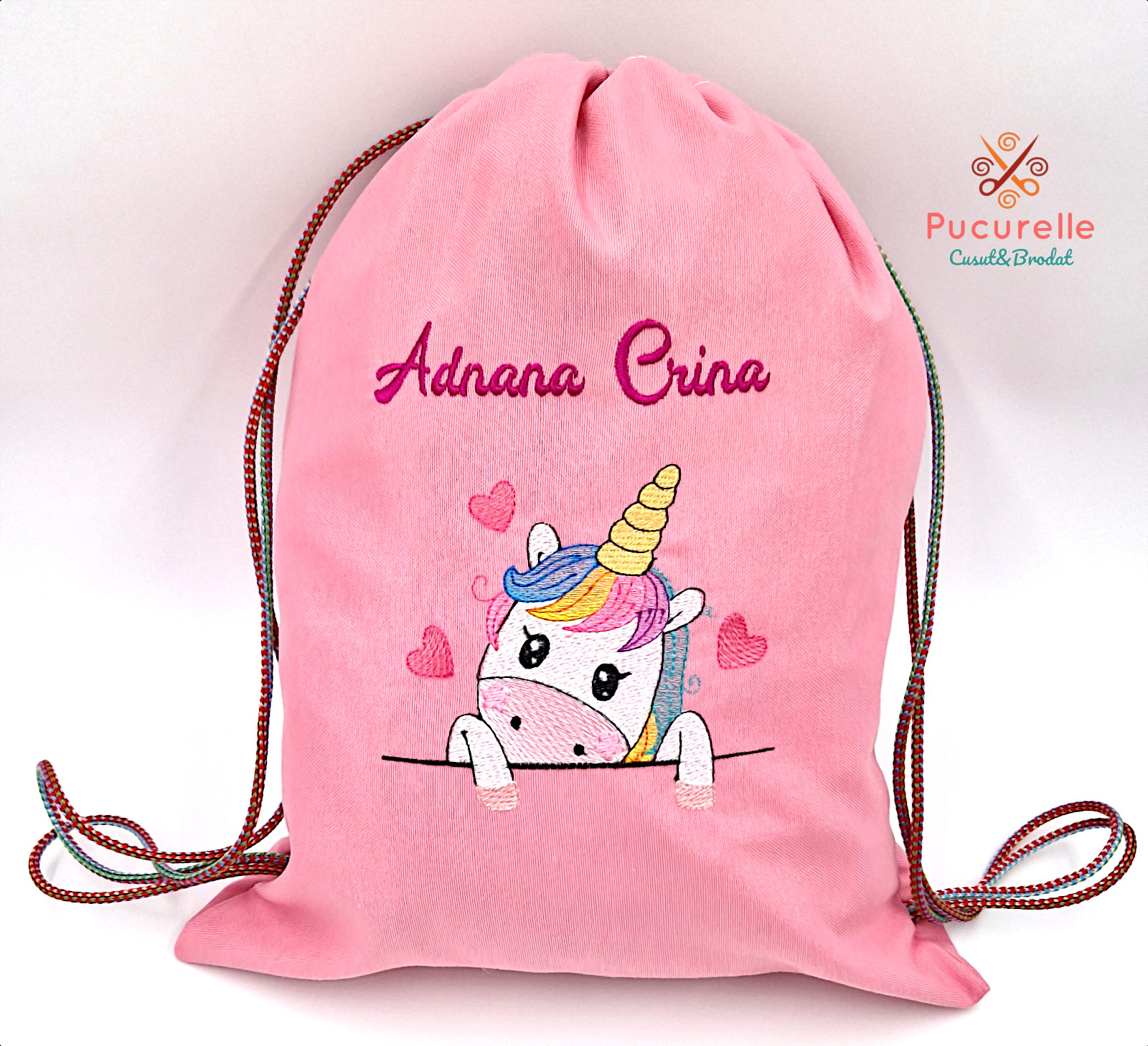 Săculeț roz personalizat pentru gradiniță "Unicorn"